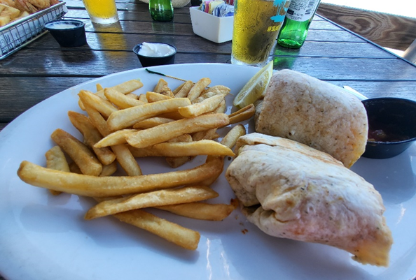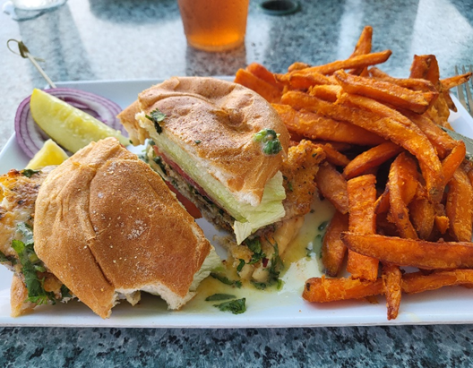 Sergio’s Hogfish Sandwich – fried hogfish with a jalapeno lime sauce with lettuce, tomato, and red onion on a kaiser roll, side pickle and sweet potato fries.